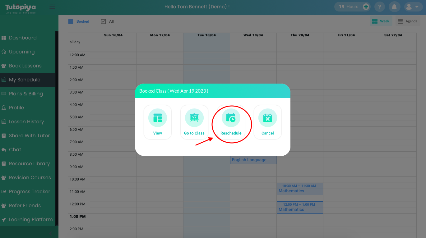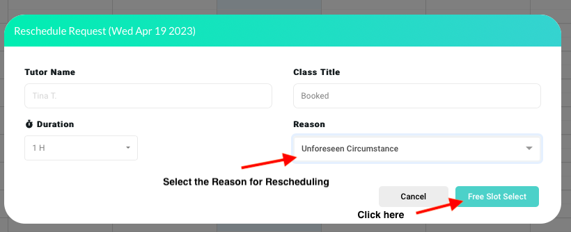 Select one of Tutors Free Slots to Reschedule the lesson And Click on Reschedule