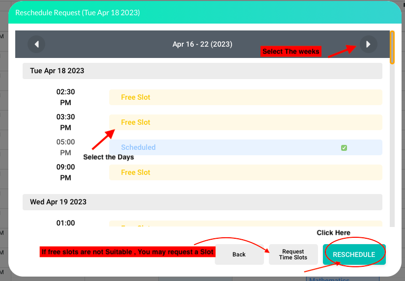 If the available free slots are not suitable, please click on the 'Request Time Slots' tab and send a request for rescheduling.