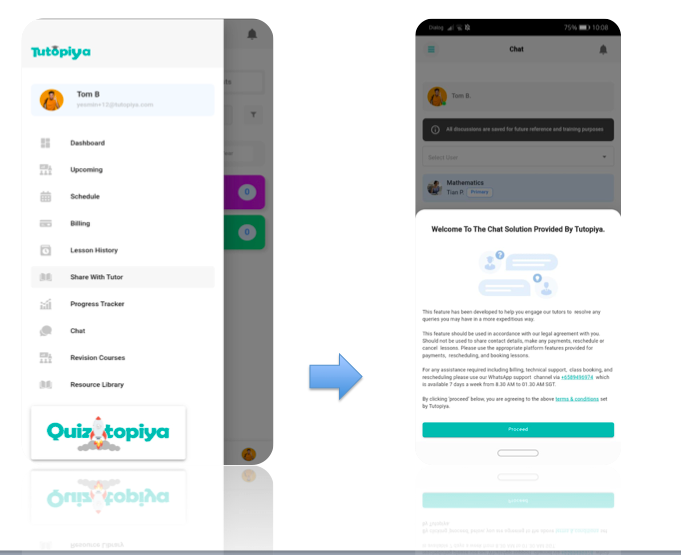 Please follow the steps below to chat with your tutor. Alternatively, you may go through the Attached Video for better clarity. Video Guide - Chat Feature Login to your Tutopiya account. Step 1: Click on the Chat tab Step 2: Please read the Terms & ...