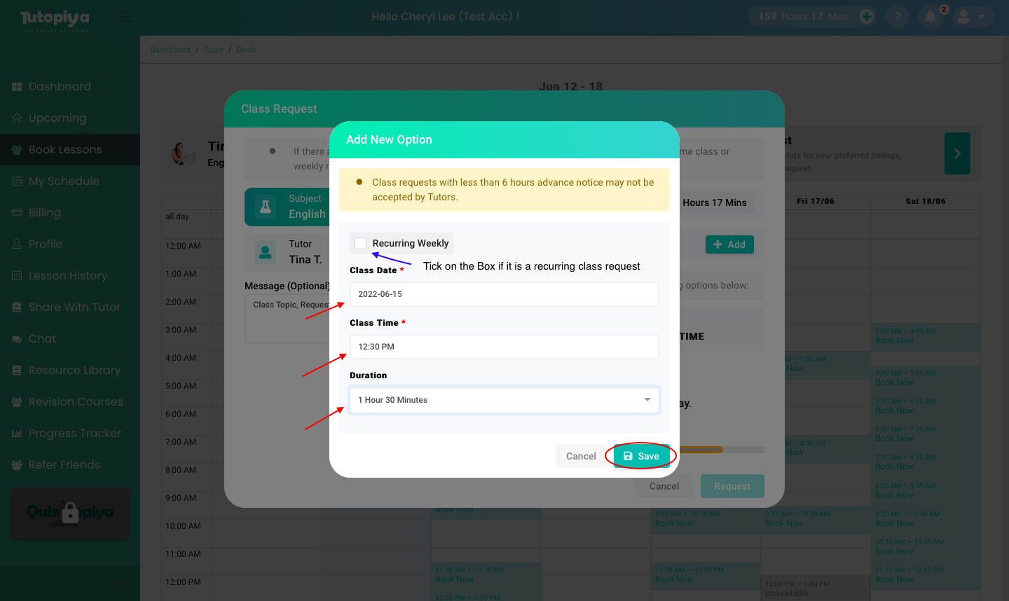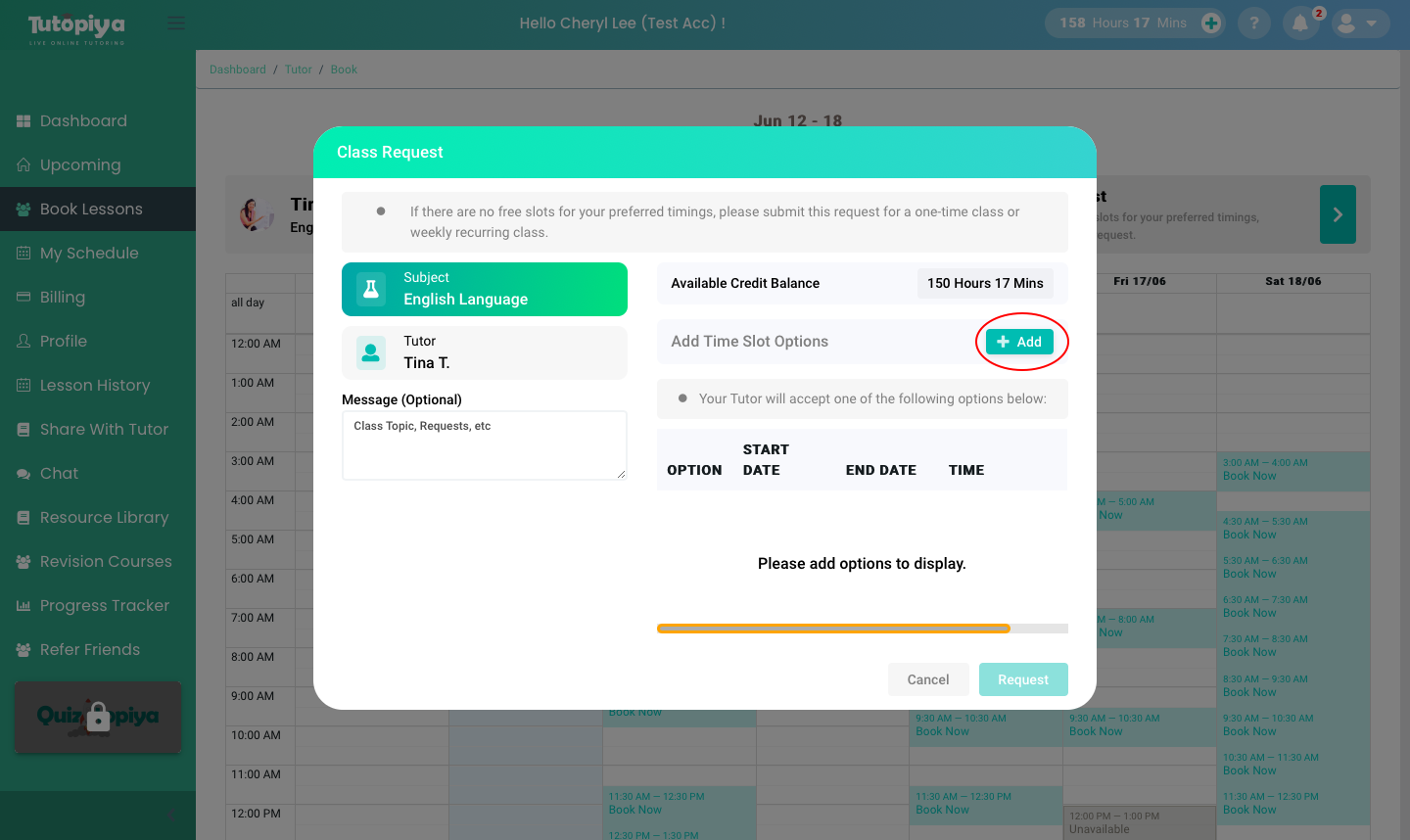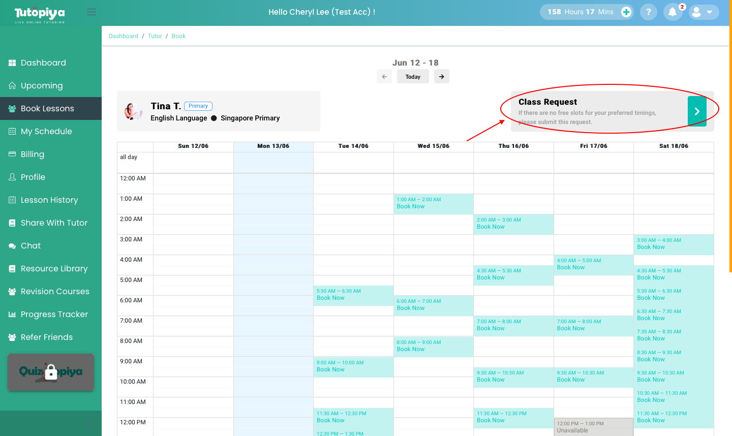 Kindly note that the request will be accepted if the tutor is available on the requested slots. If not, the request will be declined with the tutor’s reason while offering an alternative slot depending on the tutor’s availability to take the lesson.