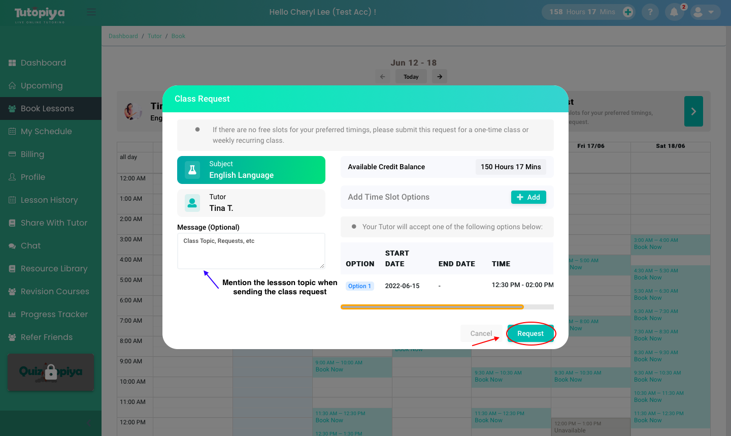 Please follow the steps below to book a lesson through the platform. Alternatively, you may go through the Attached Video for better clarity. Video Guide - How to send a Topic request to tutor Login to your Tutopiya account. Step 1: Click on the ...